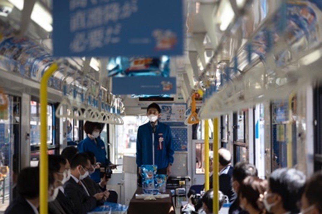 しかし、「白いブラックサンダー」は北海道土産としてお客様に人気の一方で、札幌市民の方々には北海道札幌市の工場で製造されていることがあまり知られておりません。このような状況を受け、”旅のお土産として親しまれている「白いブラックサンダー」を、地元の札幌市民の皆様にも楽しんでいただきたい”という思いから、札幌市民に長年親しまれてきた路面電車のラッピングを実施することとなりました。出発式では、ラッピング電車をお披露目のほか、札幌市交通事業振興公社 藤井透理事長や有楽製菓株式会社 代表取締役社長河合などが登壇しテープカットが行われました。