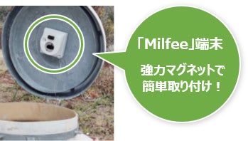 「Milfee」端末を既存の飼料タンクに後付けすることで、タンク内の残量を計測して遠隔で一括管理ができます。工事不要でマグネットでポン!と、とりつけることができるたった5分の簡単設置。農家様ご自身でも容易にとりつけ可能です。