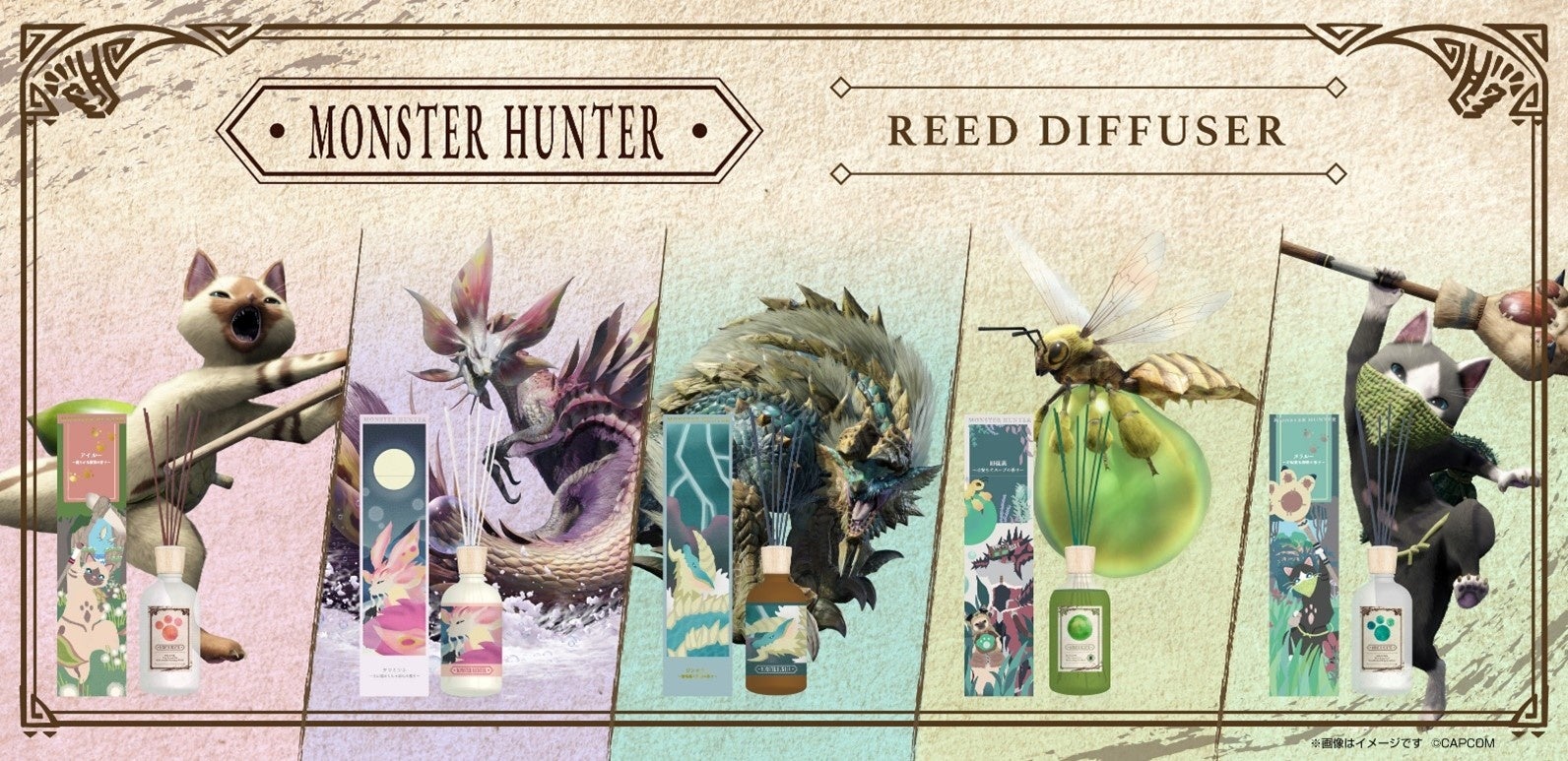 香り雑貨ブランド「fav’s room TOKYO」から、大人気ゲーム「モンスターハンター」の「ジンオウガ」「タマミツネ」「アイルー」「メラルー」「回復薬」をモチーフにしたディフューザーが新登場!