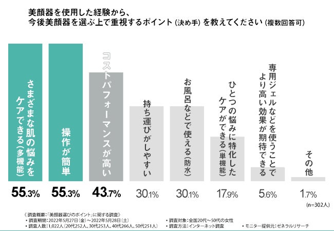 「美顔器を使用した経験から、今後美顔器を選ぶ上で重視するポイント(決め手)を教えてください(複数回答可)」と質問したところ、『さまざまな肌の悩みをケアできる(多機能)(55.3%)』『操作が簡単(55.3%)』という回答が同率で最も多く、次いで『コストパフォーマンスが高い(43.7%)』『持ち運びがしやすい(30.1%)』『お風呂などで使える(防水)(30.1%)』『ひとつの悩みに特化したケアができる(単機能)(17.9%)』『専用ジェルなどを使うことでより高い効果が期待できる(5.6%)』と続きました。