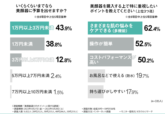 有限会社 GM CORPORATION(本社所在地:大阪市、代表取締役:岡村裕子)は、全国20代~50代の女性を対象に、「美顔器選びのポイント」に関する調査を実施しました。