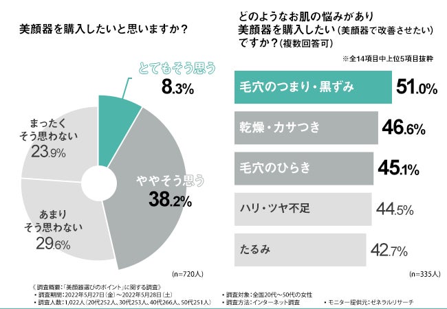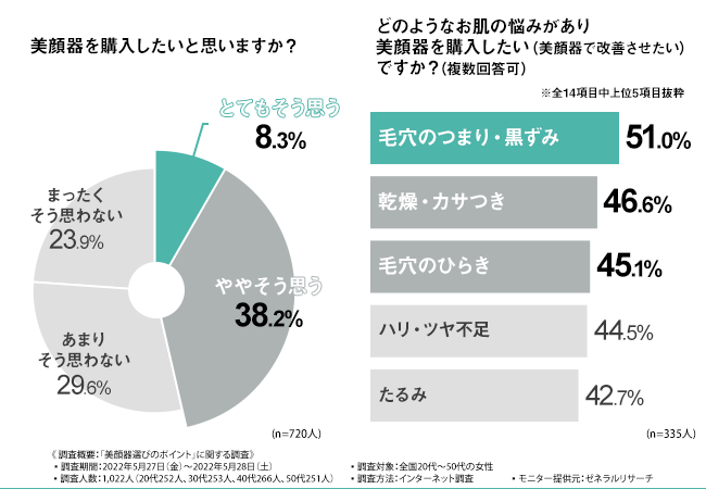 『とてもそう思う』『ややそう思う』と回答した方に、「どのようなお肌の悩みがあり美顔器を購入したい(美顔器で改善させたい)ですか?(複数回答可)」と質問したところ、『毛穴のつまり・黒ずみ(51.0%)』という回答が最も多く、次いで『乾燥・カサつき(46.6%)』『毛穴のひらき(45.1%)』『ハリ・ツヤ不足(44.5%)』『たるみ(42.7%)』と続きました。