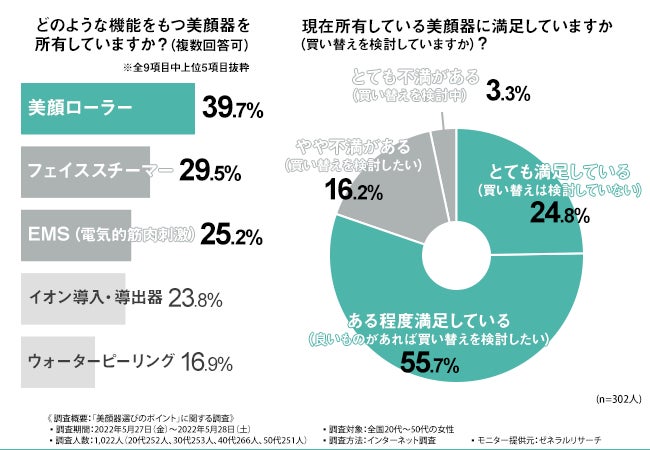 その一方で、美顔器を所有している方のおよそ5人に1人が、効果を実感できていなかったり操作性が悪かったりなどの理由で、所有している美顔器に満足していない実情も明らかになりました。