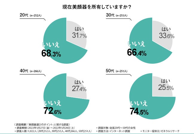 全ての年代で美顔器を所有している方はまだ少ないようですが、20代・30代は『はい』がともに3割を超えており、若い世代を中心に美顔器が浸透しつつある傾向がうかがえます。