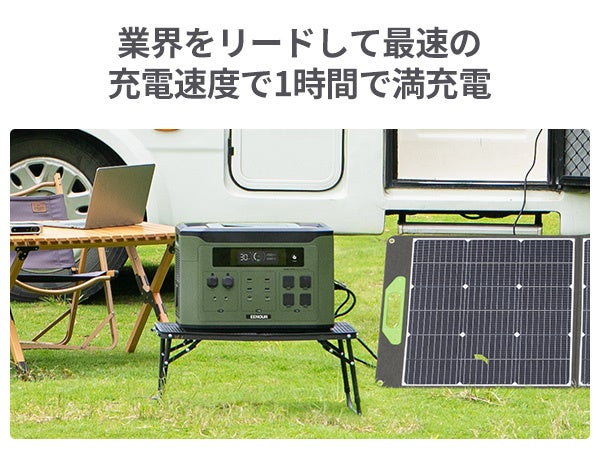 従来品と比べるとAC1500WとPV1000Wのデュアル入力による高速充電で大容量ながら僅か1時間で空の状態から満充電が可能です。急な出発や利用でも充電が間に会えて安心感たっぷりです。