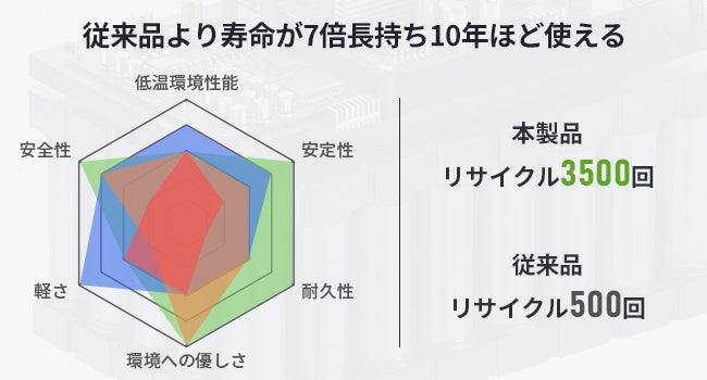 内蔵電池はリン酸鉄リチウムバッテリー(LiFePO4)を採用することで、従来型より寿命が7倍長持ち、1日充電したり1日放電したりすると推定しても10年程使うことが問題なく安全性と耐久性を兼ね備えます。