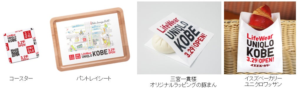 3月15日(金)からは、神戸三宮センター街の協力店舗において、オープンを記念した「コースター」やパン屋が多い商店街の特徴にあわせ「パントレイシート」をオリジナルで制作し無料配布します。また、創業60年以上の中華料理店「三宮一貫楼 本店」では、商品のご提供時に使用いただくオリジナルの包み紙を数量限定で制作。さらに、「イスズベーカリー」では、ユニクロの赤をモチーフにした「ユニクロワッサン」が期間限定で販売されるなど、地域に密着したキャンペーンを展開します。