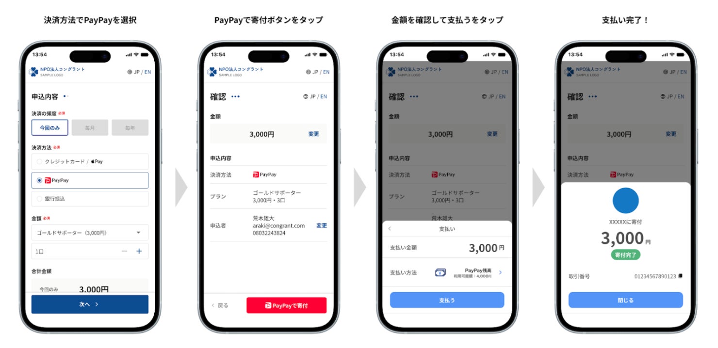 この度、寄付・募金の新しい支払い手段として「PayPay」をコングラントの決済機能に拡充しました。「PayPay」の法人向けビジネスアカウントの契約後、コングラントの寄付DXシステムで支払い方法として「PayPay」の設定が可能になります。