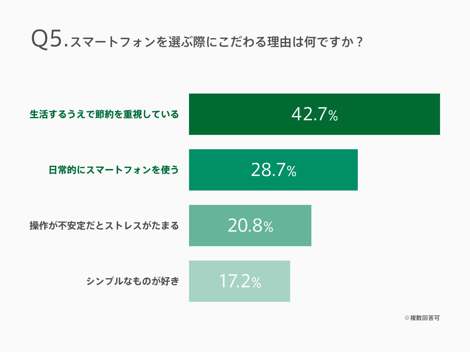 さらに、こだわりの理由を聞いたところ、「生活するうえで節約を重視する」「操作が不安定だとストレスがたまる」「シンプルなものが好き」といった、こだわりのランキングとも連動した理由が上位に。昨今の円安により、さまざまな商品の値上げが続く社会背景が、スマートフォンを選ぶ際の節約志向にも影響していると考えられます。さらに「日常的にスマートフォンを使う」という理由も多く、スマートフォンを使用する機会が増えたことで、こだわる点も多様化していることが判明しました。