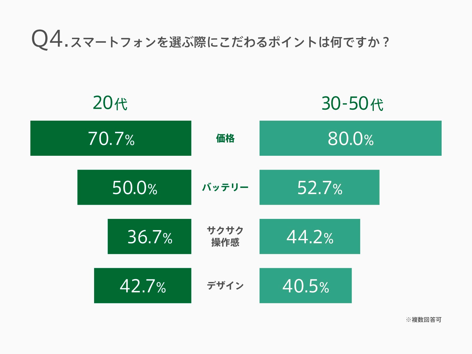 また世代別では、30代~50代は20代に比べて「価格」や「バッテリー容量」「サクサク操作できる」「デザイン」へのこだわりを持っている人が多いことが分かりました。