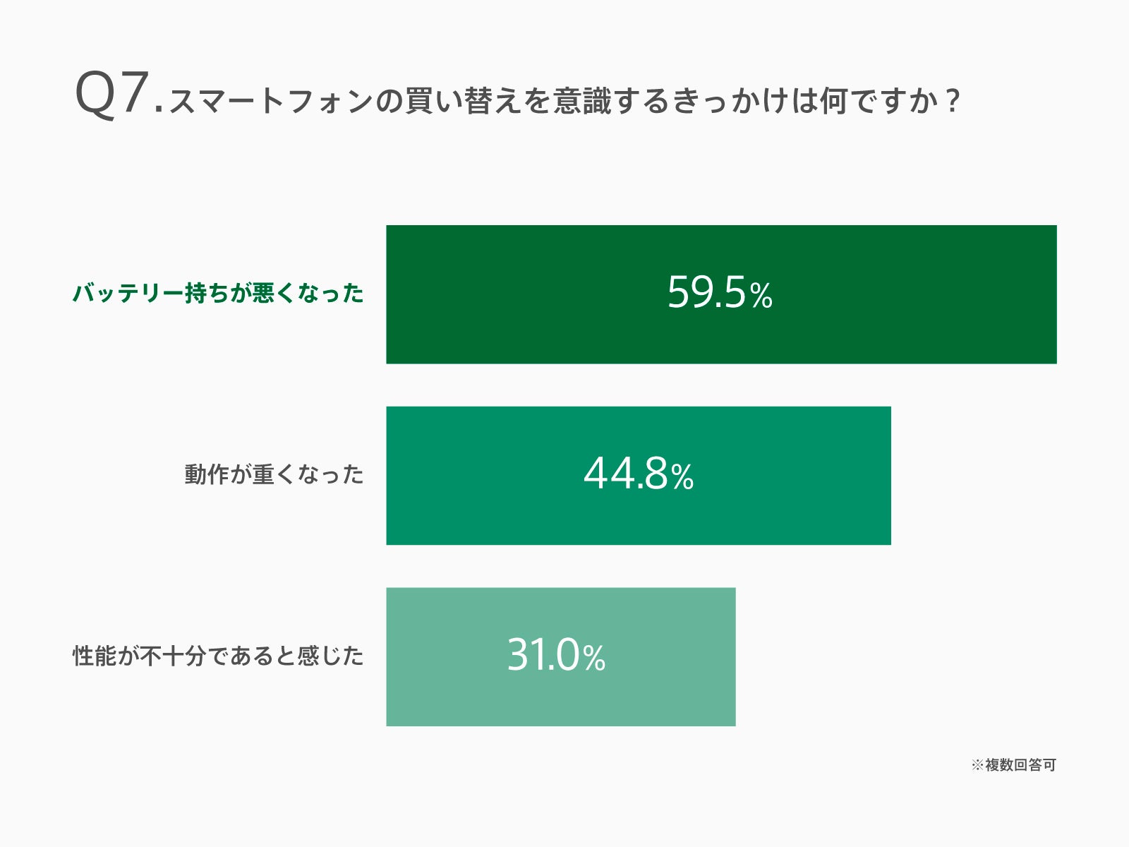 また、スマートフォンの買い替えを意識するきっかけについて尋ねた調査では、TOP3に「バッテリーの持ちが悪くなったとき」「動作が重くなったとき」「スマートフォンの性能が不十分であることを感じるとき」がランクインしました。こだわり上位の「バッテリー容量」や「サクサク操作できる」ポイントが、買い替えきっかけにも影響していることが考えられます。