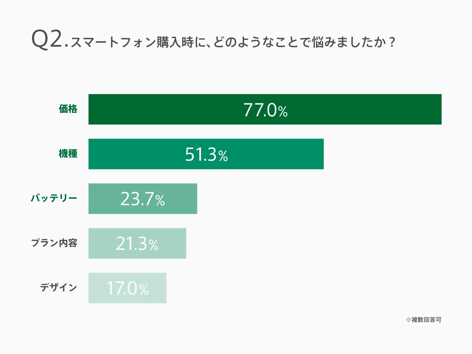 次にスマートフォン購入時の悩みの要因について尋ねたところ、1位は「価格(77.0%)」の結果に。さらに世代別で要因を比較すると、30~50代はスマートフォンのスペック面において「バッテリーの持ち具合」で一番悩んでいることが分かりました。