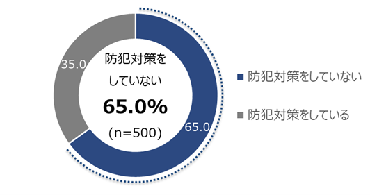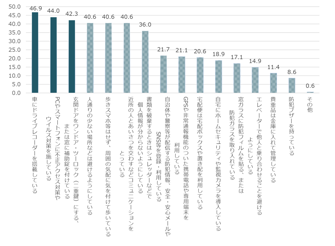 日常的に防犯対策を行っているか聞くと65.0%が「対策をしていない」と答えました【図5】。防犯対策をしている人の具体的な内容トップ3は、1位「車にドライブレコーダーを搭載している」(46.9%)、2位「PCやスマートフォンに不正アクセス対策やウイルス対策を施している」(44.0%)、3位「玄関ドアをワンドア・ツーロック(二重鍵)にする、または窓に補助錠を付けている」(42.3%)となりました【図6】。