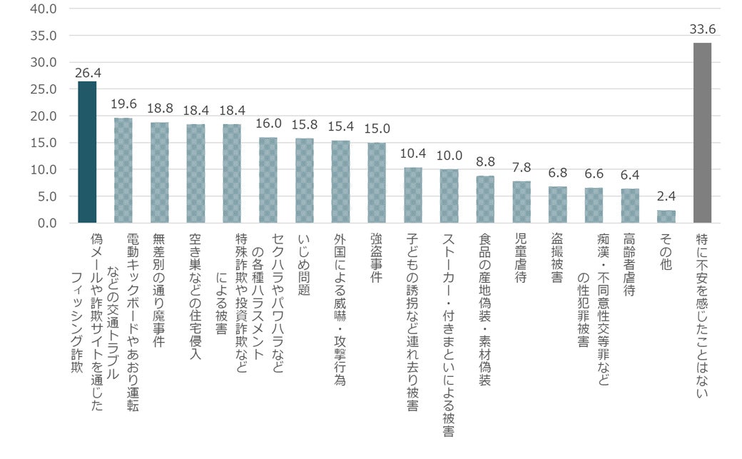 最近1年間で不安を感じた事件・事故について聞いたところ、「偽メールや詐欺サイトを通じたフィッシング詐欺」(26.4%)が2年連続で1位になりました。「空き巣などの住宅侵入」「特殊詐欺や投資詐欺などによる被害」(いずれも18.4%)も上位となり、金銭に関係する犯罪行為が生活者の日常に不安を与える要因となっていることが推察されます【図7】。
