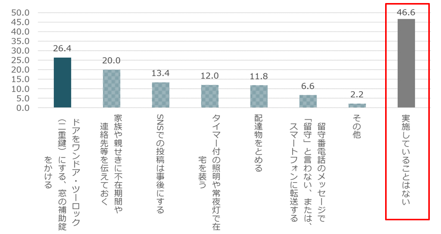 治安悪化が不安視されるなか、長期の帰省や旅行で家を無人にするときの防犯対策について聞くと、46.6%の人が「実施していることはない」と答えました。一方、防犯対策を講じている人では、「ドアをワンドア・ツーロック(二重鍵)にする、窓の補助錠をかける」(26.4%)が最も多いことが分かりました【図2】。