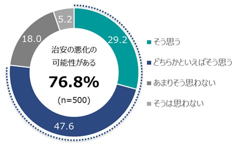 今後、治安の悪化や犯罪が増加する可能性があると思う人は全体の76.8%(「そう思う」(29.2%)「どちらかといえばそう思う」(47.6%)の合計)に上り、3年連続で増加しました(2023年76.0%、2022年71.0%)【図1】。