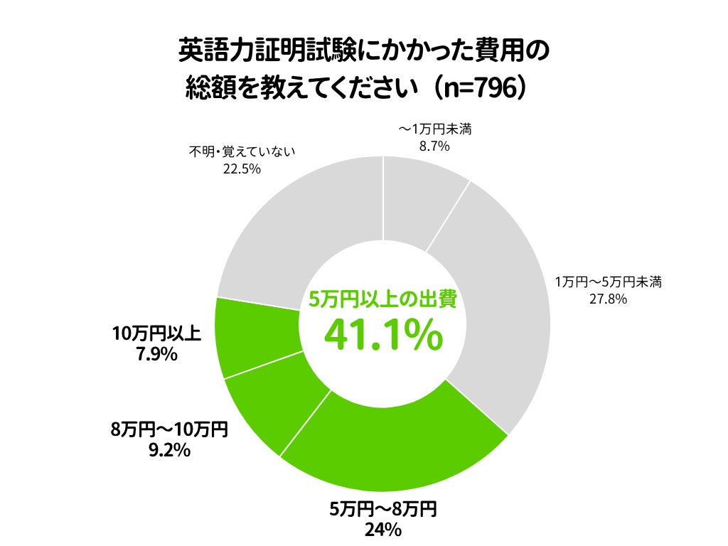 英語力証明試験は2回以上受けている人が66%。試験にかかった費用は5万円以上の出費が41.1%にのぼり、経済的な負担の大きさが浮き彫りに