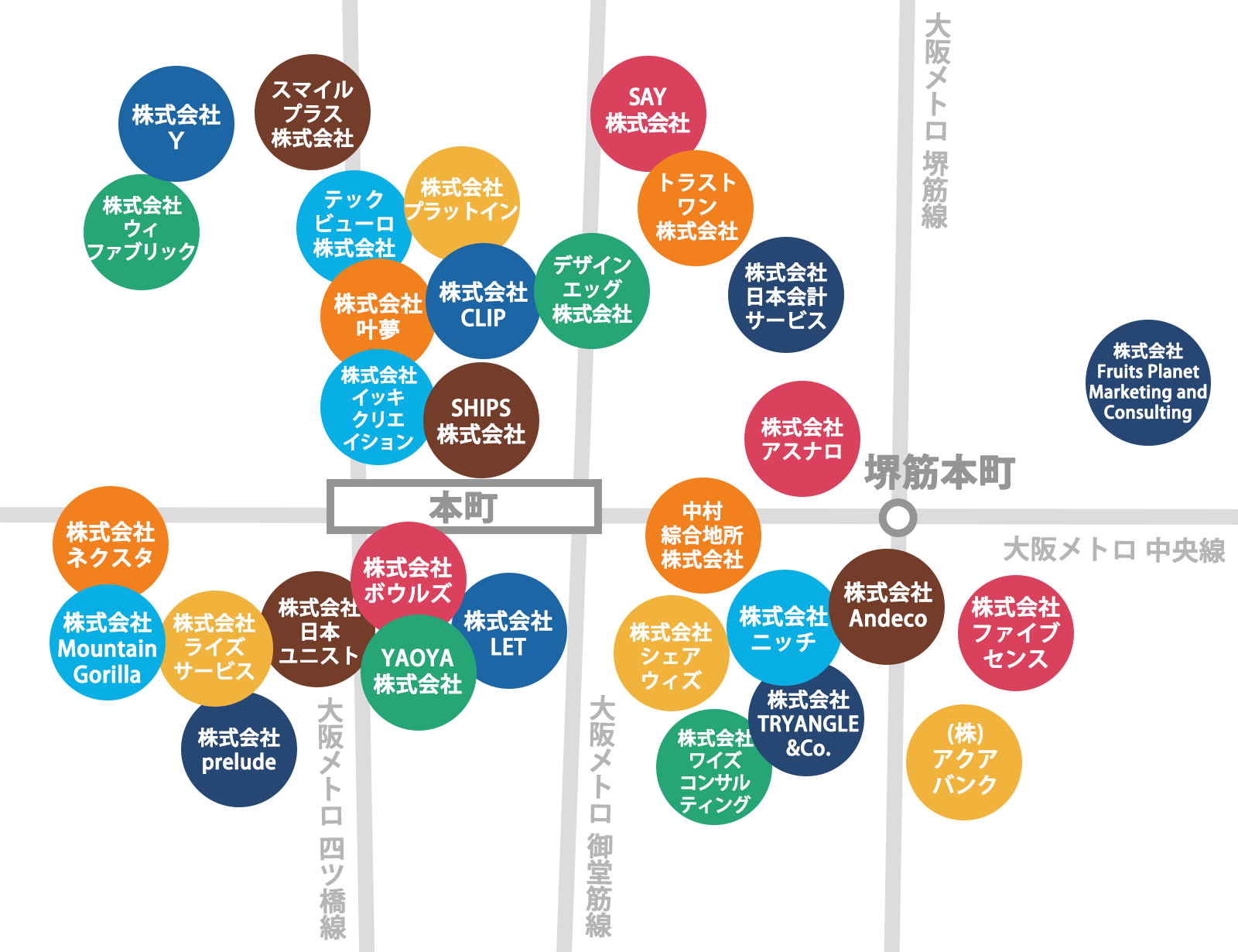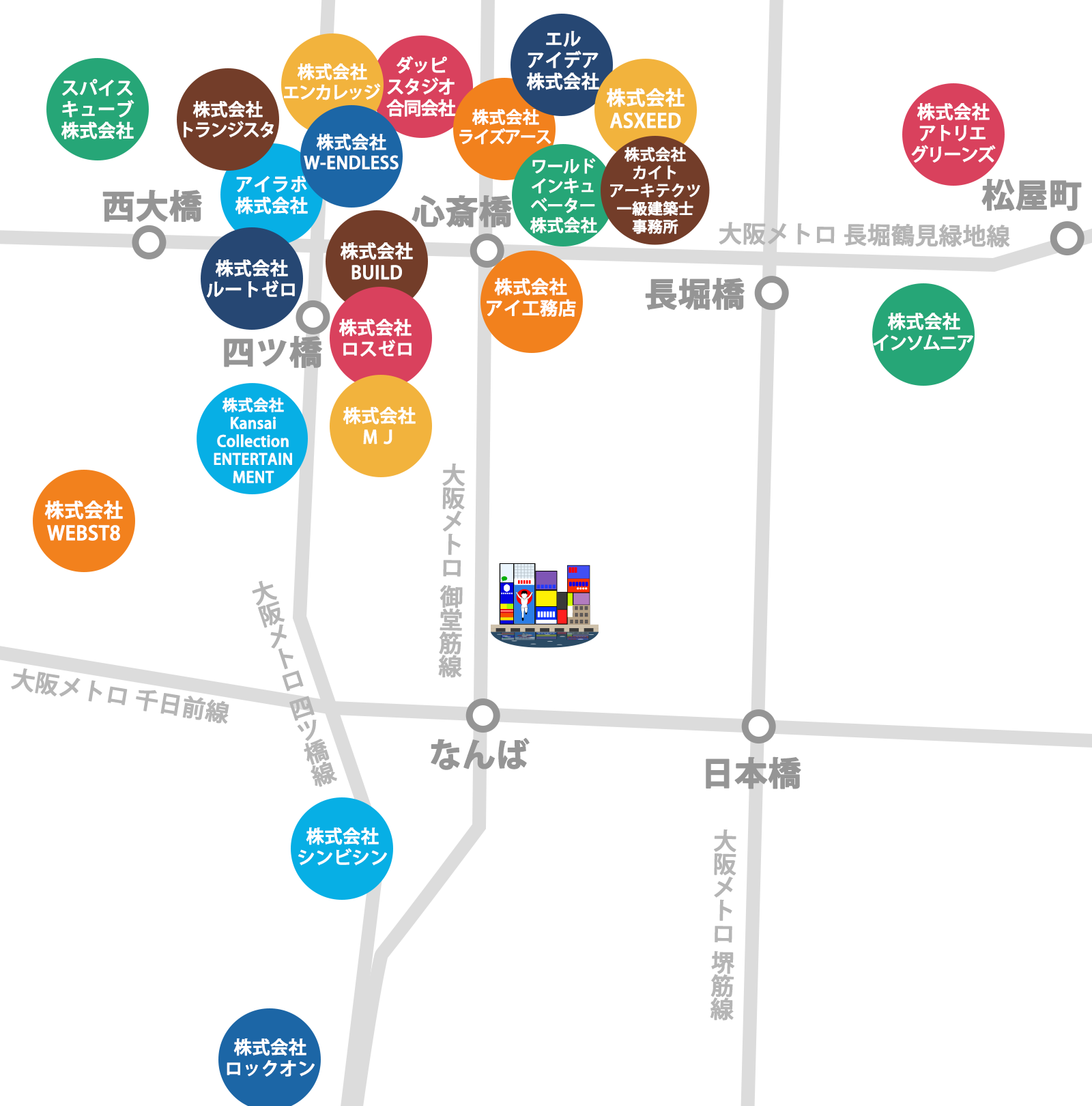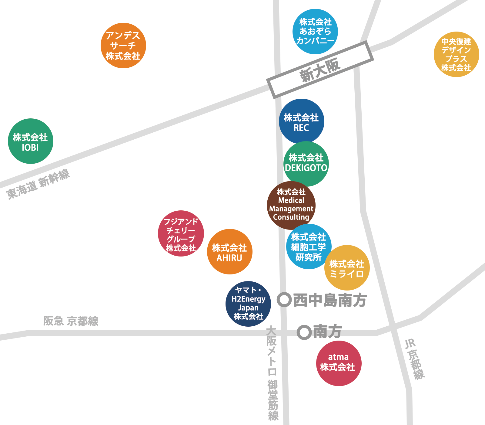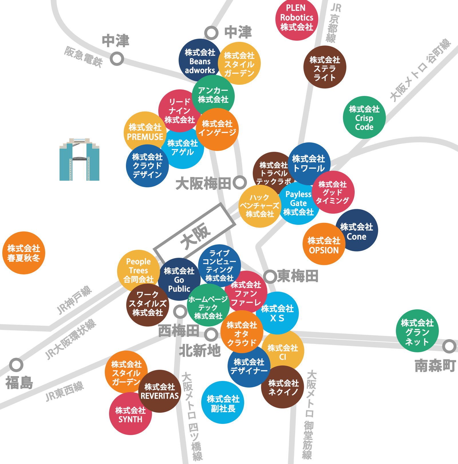 大阪のスタートアップ企業の所在地を可視化することにより、産業地としての集積、認知度のアップを図る目的で作成しました。今後も地図に掲載する企業を順次追加していきます。