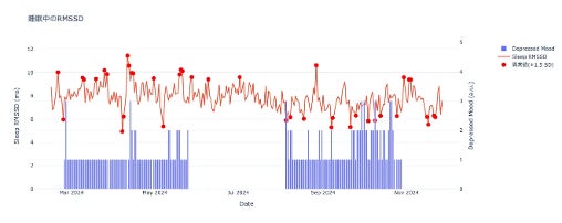夜間RMSSDが個人のベースラインから1.5標準偏差以上低下した場合、約87% の確率(14日中13日)で7日以内に抑うつスコア(Depressed Mood)が悪化