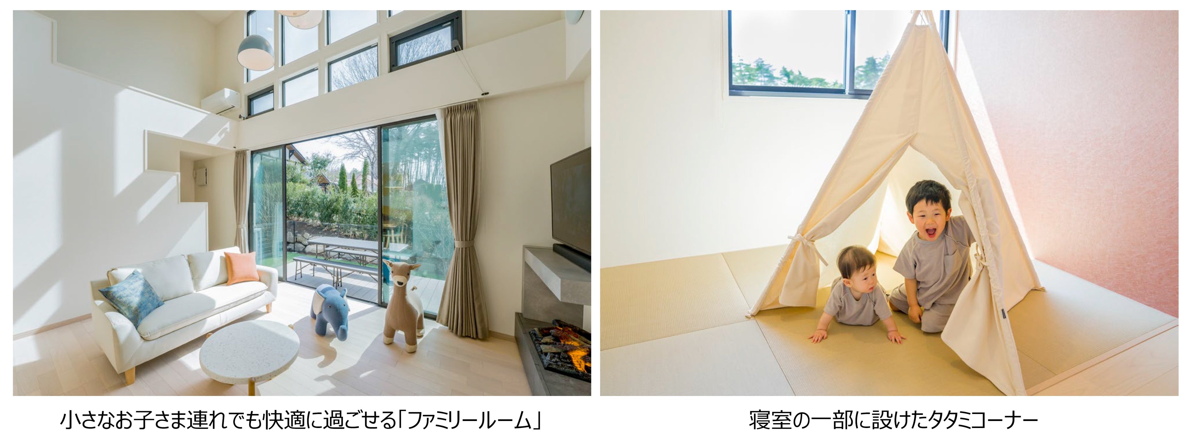 このたびオープンする「Rakuten STAY VILLA 八ヶ岳」では、ミサワホームがこれまでさまざまな家族の好みやライフスタイルに合わせた住まいづくりを行い、豊かな暮らしを提供してきたノウハウが生かされています。ミサワホームが配棟およびプランを計画し、ミサワホームグループのエクステリア専門会社、ウィズガーデンによる造成・外構監修のもと、ミサワホーム甲信が設計施工を担当して建設しました。そして、ミサワホームグループ設計施工による第一弾の「Rakuten STAY」施設開業を記念し、ミサワホームのオーナーさまやお客さま、取引先法人従業員など最大85組さまを対象に先着順で宿泊料金が割り引かれる「Rakuten STAY VILLA 八ヶ岳 開業記念キャンペーン」を行います。