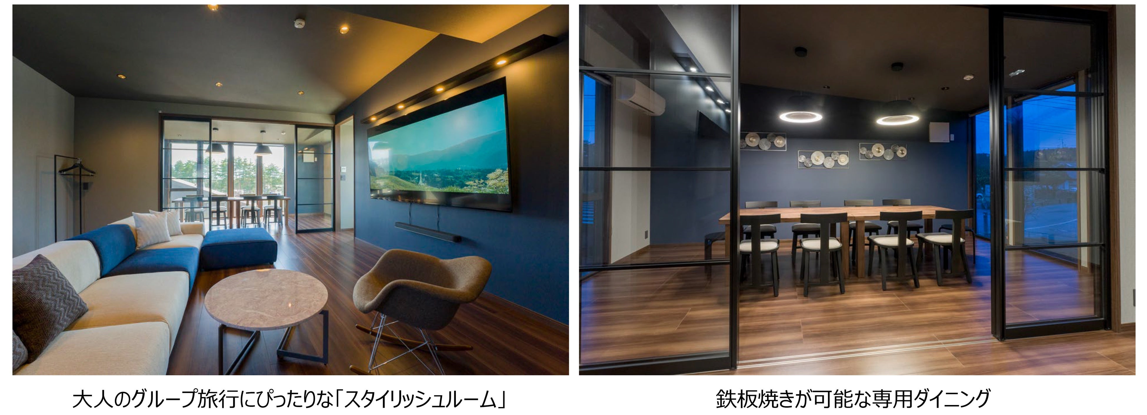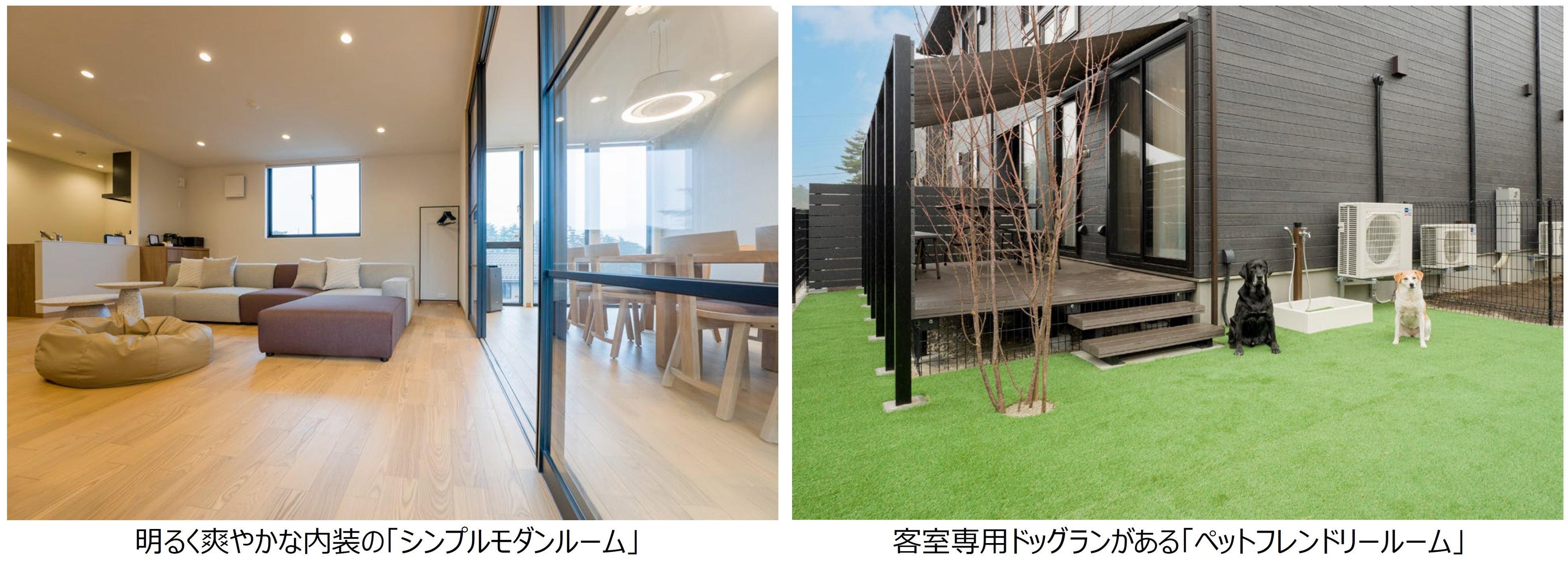 すべての客室に、ジャグジー機能付きの石張りの浴室や鉄板焼きが可能な専用ダイニング、約100インチ大画面ホームプロジェクターの設置に加え、家電や調理器具を備えるなど、長期の滞在でも快適に過ごせる設備が充実。客室タイプは、豊かな自然と調和した落ち着いた雰囲気の「スタイリッシュルーム」、明るく温かみのある雰囲気の「シンプルモダンルーム」、キッズ・ベビー用品を設置したカジュアルで明るい雰囲気の「ファミリールーム」の3つのタイプから目的や好みに応じた選択が可能です。また、大切なペットと一緒に宿泊できる「ペットフレンドリールーム」など、コンセプトを設けた客室もあり、特別な宿泊体験を彩ります。