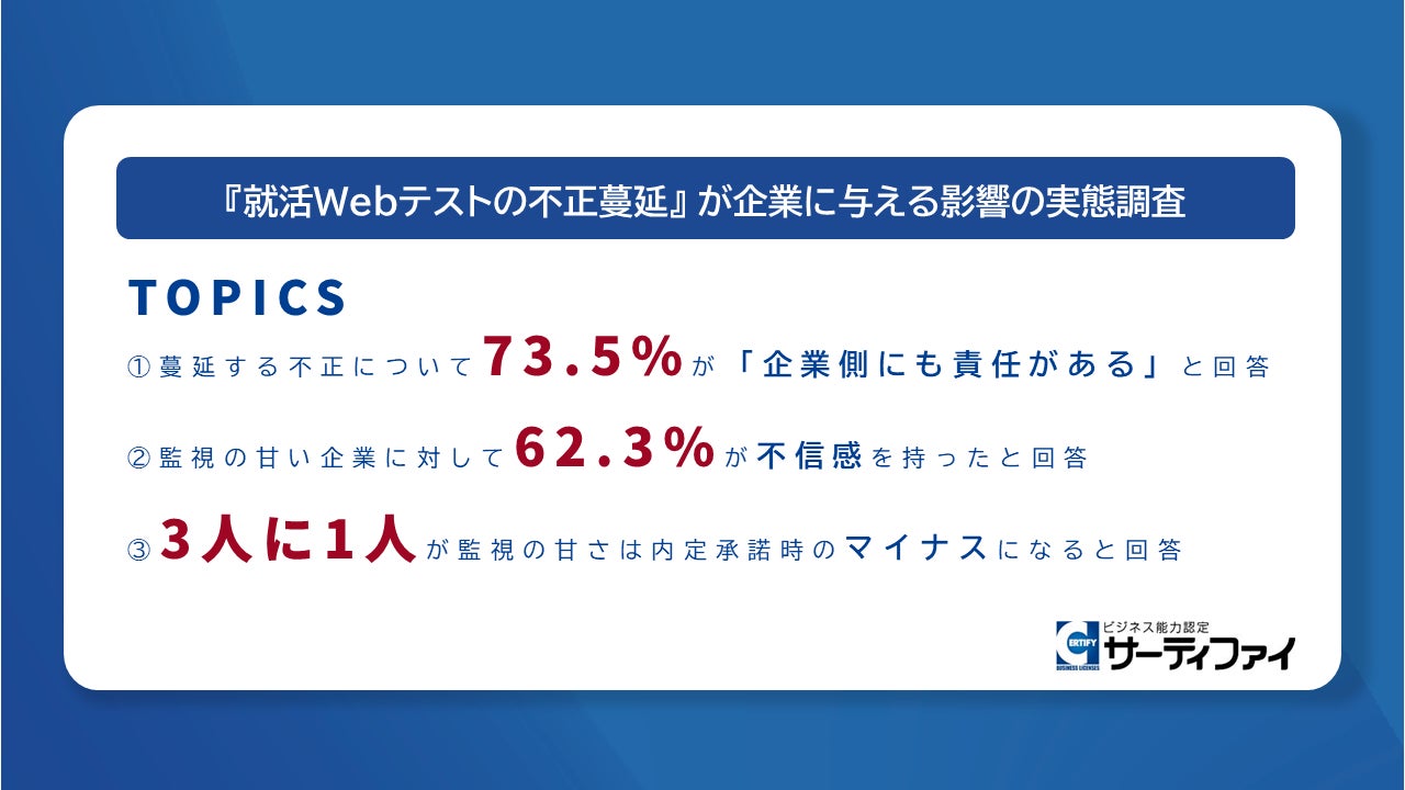 ビジネス資格・検定試験を主催する株式会社サーティファイ(東京都中央区、代表取締役:瀧澤茂、以下「サーティファイ」)は、不正行為が蔓延する「オンライン就職活動」についての追加調査を⾏いましたので調査結果を公開します。
