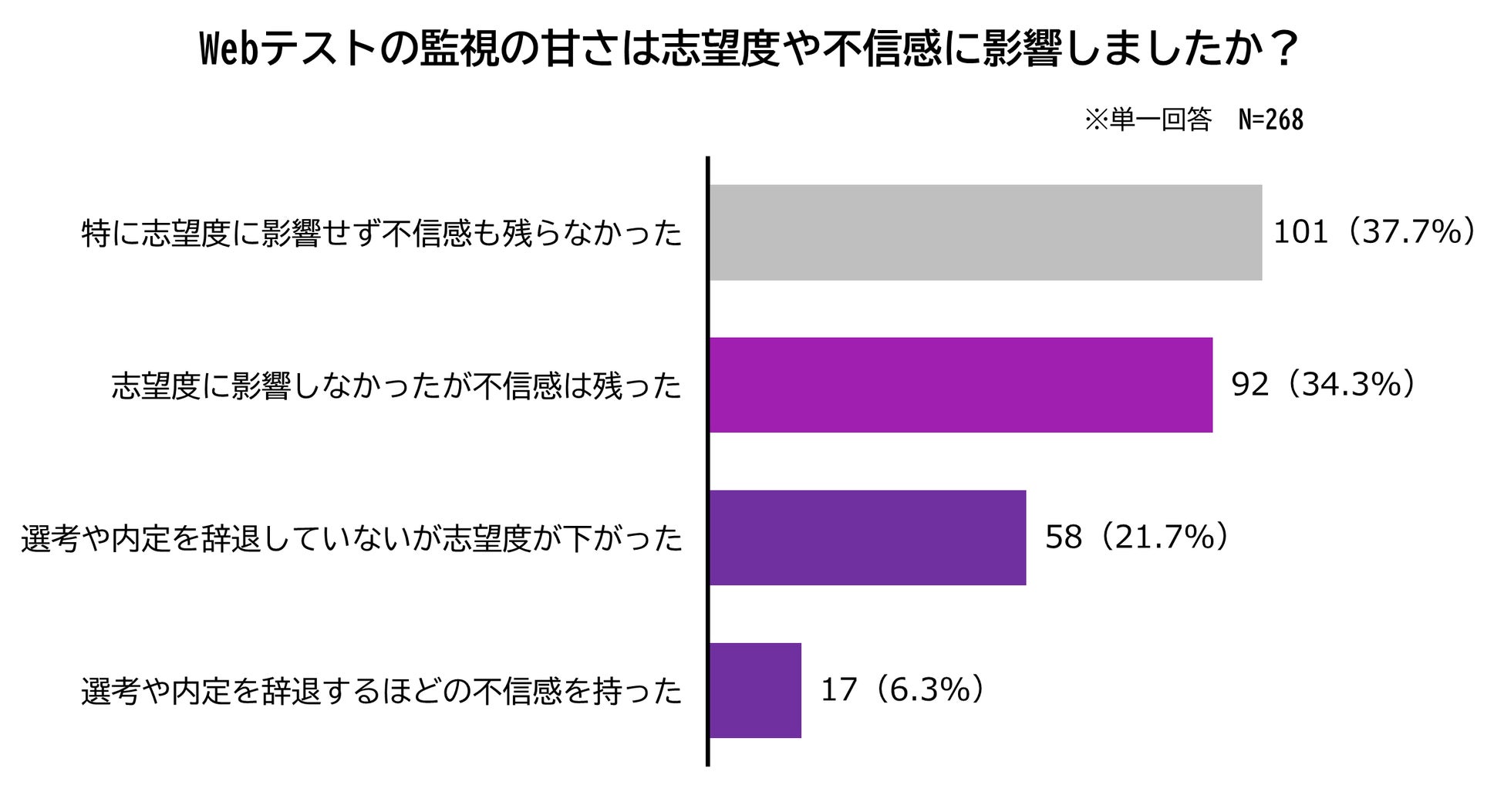 32%の回答者がWEBテストの監視が甘いことが内定承諾先の選定時にマイナスになると答え、Webテストの監視体制が候補者にとって一定の判断材料となっていることが明らかになりました。