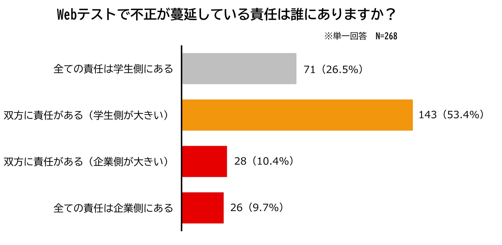 70%以上が企業側にも責任があると回答し、そのうち「双方に責任があるが企業側が大きい」と「全ての責任は企業側にある」という回答だけで20%以上にのぼります。この結果は、オンライン試験における不正行為が学生個人だけの問題ではなく、企業側の監視の甘さに課題があると認識されていることを示しています。