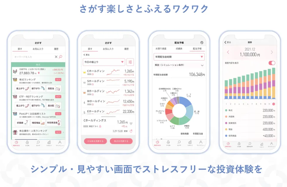 今回の2023年度グッドデザイン賞では、デジタル・ネイティブ世代の投資初心者のお客様に対して、長期資産形成をサポートするために必要な証券サービスの機能(国内株、米国株、投資信託、ポイント投資、クレカ決済、資産管理機能など)をひとつのアプリに集約しながらも、親しみ易いデザイン性と直感的な操作性を実現したことが評価されています。