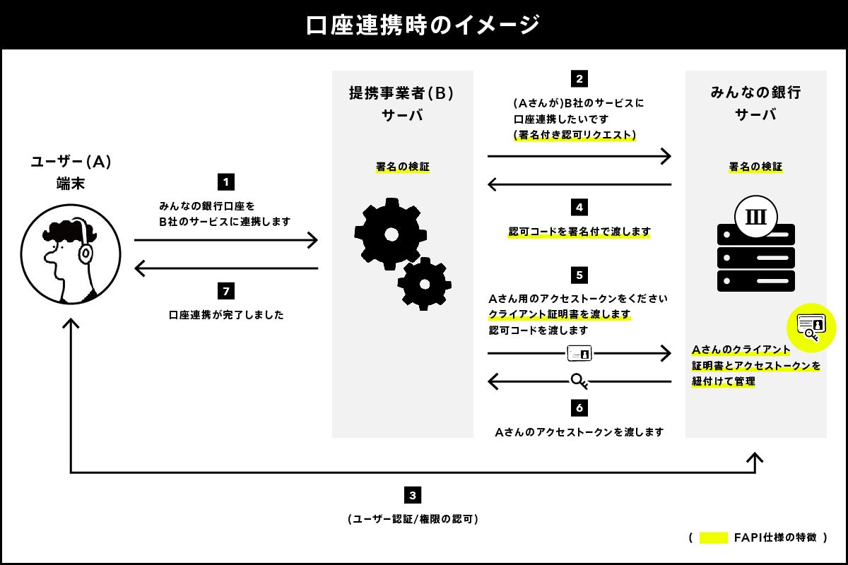 提携事業者とのAPI連携時の認可リクエストが安全な方法によって署名・検証され、みんなの銀行へアクセストークンの発行を要求(あるいは使用)する際に、mTLS(*7)によるクライアント証明書を要求し、アクセストークンとクライアント証明書を紐付けして検証されることで高いセキュリティを実現します。