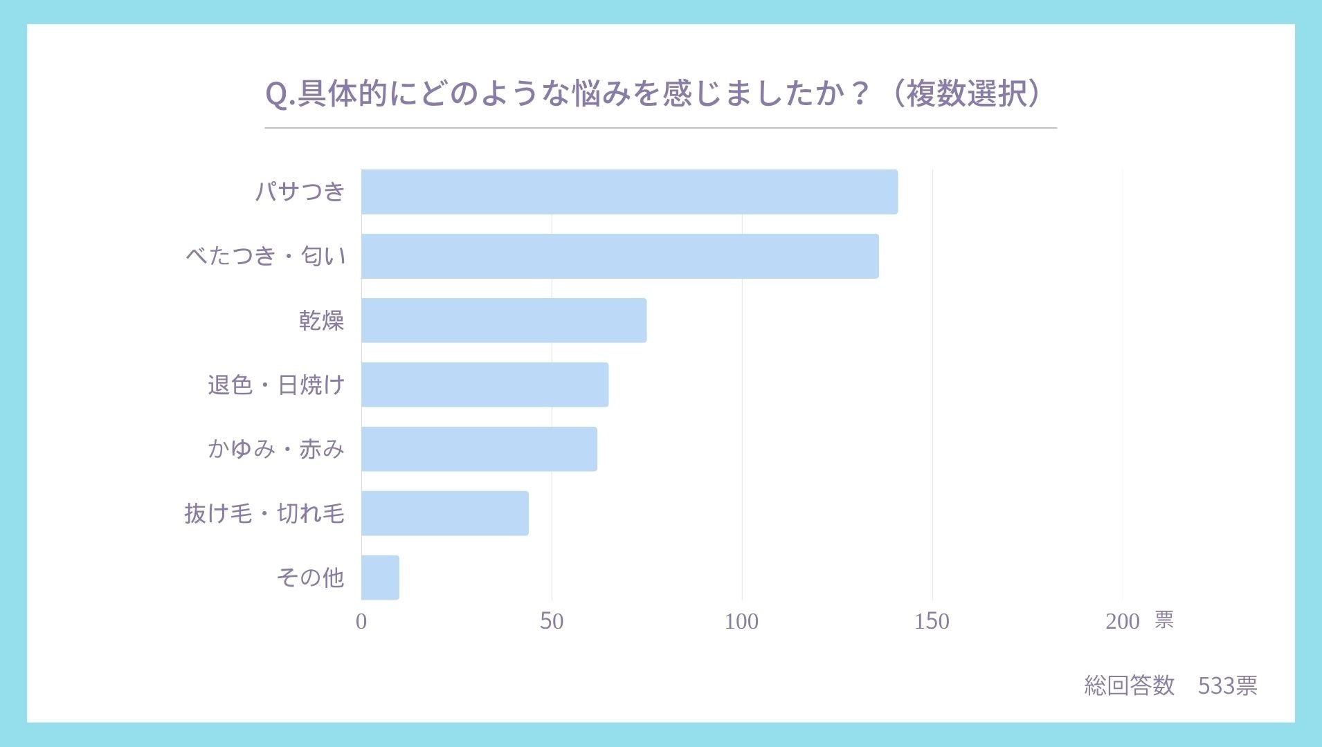 1位が「パサつき(192票)」、2位「乾燥(168票)」、3位「ベタつきやにおい(134票)」となり、紫外線や湿気、汗による髪や頭皮へのダメージが浮き彫りに。