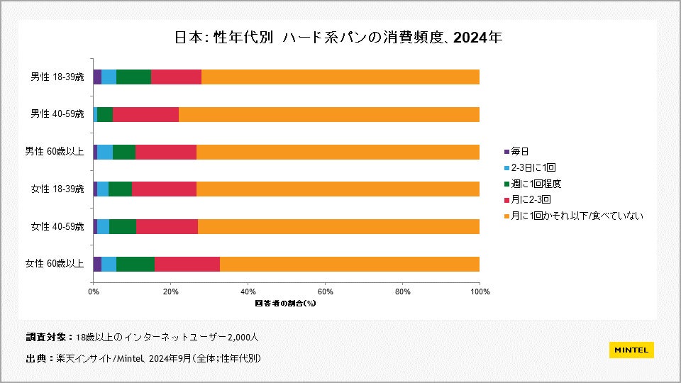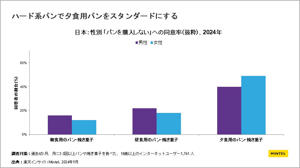 こうした中で見えてきたのが、夕食にパンを提案するという未開拓の可能性です。ミンテルの調査では、夕食用のパン・焼き菓子を購入しない人が、女性では約半数を占め、特にスープやおかずと食べることが多いハード系パンは年齢を問わずあまり食されていません。この状況を打開する鍵として、和食との相性を高めた「出汁パン」など、新たなパン開発が進行中です。