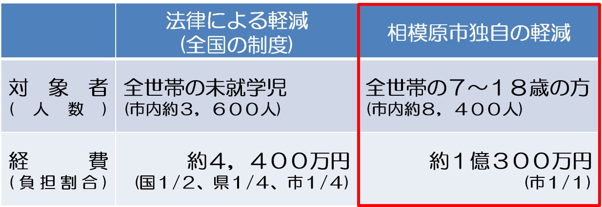 一方で、市は「相模原市総合計画」で定めた3つの重点テーマの一つに「少子化対策」を掲げ、誰もが安心して子育てすることのできる環境づくりを進めていることから、広く子育て世帯の負担を軽減するため、均等割軽減の対象年齢を18歳まで拡大することとしました。