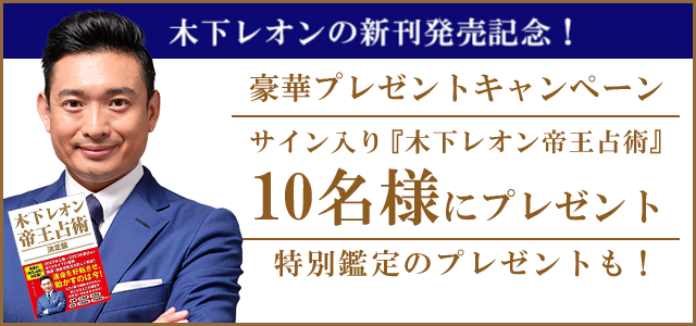 対象の鑑定をご購入された方へ、木下レオンの直筆サイン入り最新書籍「木下レオン帝王占術」を抽選で10名様にプレゼントいたします。さらに、対象鑑定をご購入の方全員へキャンペーン特別鑑定のプレゼントもございます。ぜひこの機会に「木下レオンの占い」をご利用ください。
