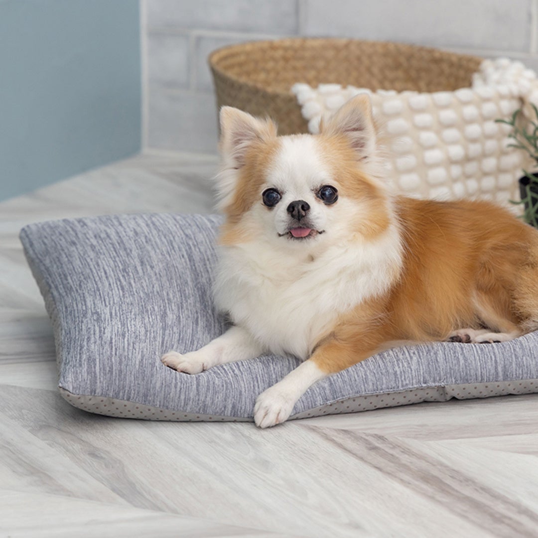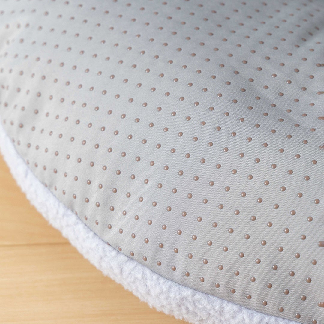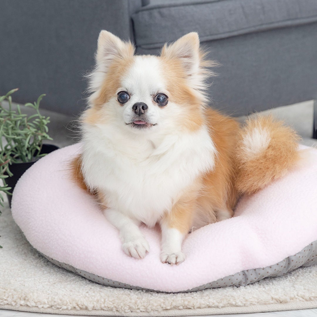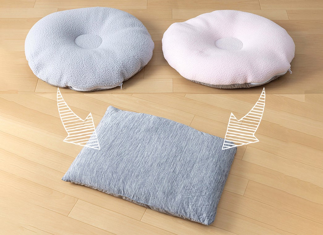 ふんわりとした手触りが気持ちいい、丸い「ペット用リバーシブルベッド」は、ライトグレーとライトピンクの2色展開。ファスナーを開き、内側の布を出してビーズを移動させると、四角いグレーの冷感ベッドに変身するリバーシブルタイプになっており、オールシーズンお使いいただけます。