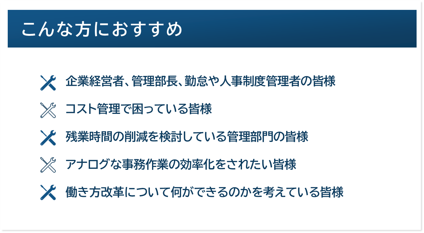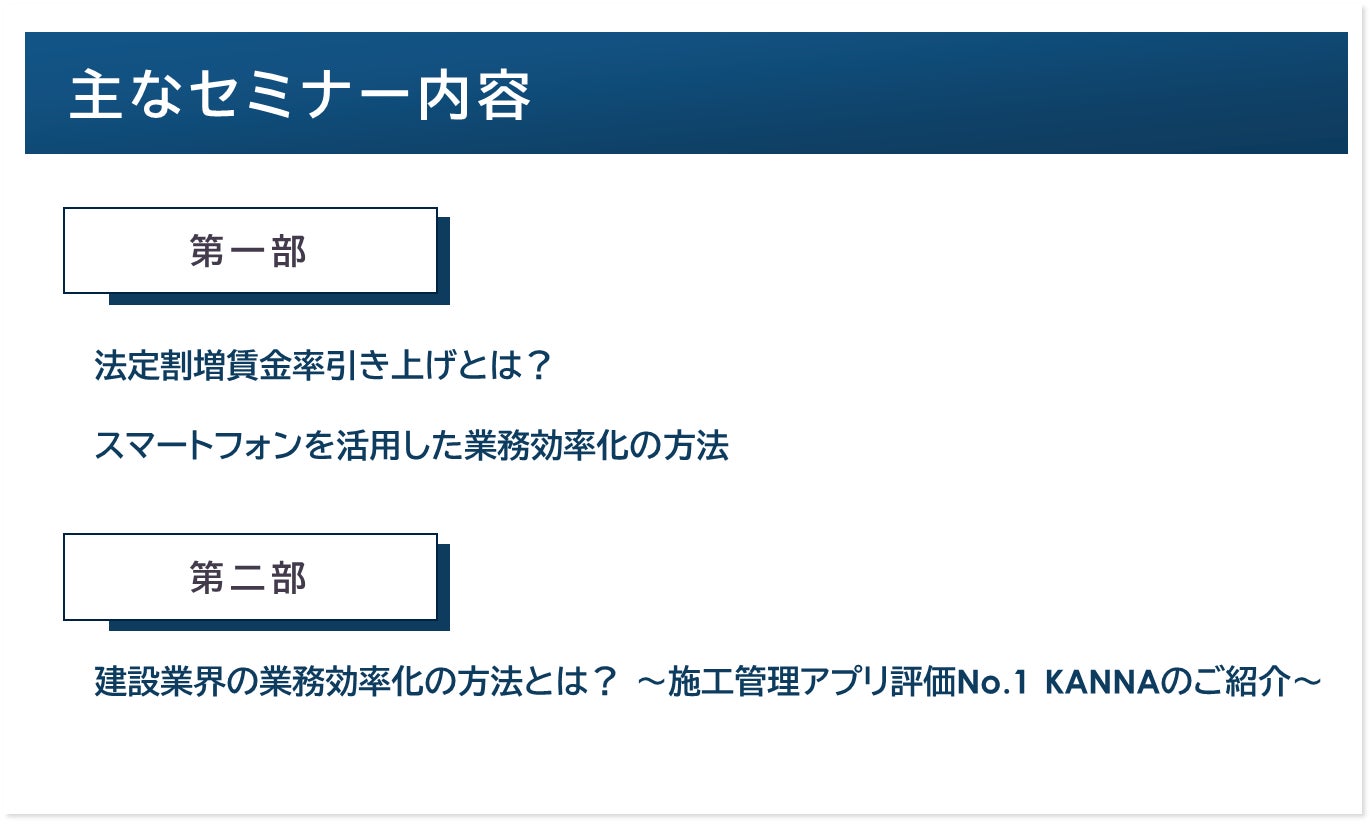 本セミナーの第一部では、法定割増賃金率引き上げとは?スマートフォンを活用した業務効率化の方法。第二部では、建設業界の業務効率化の方法とは?施工管理アプリ評価No.1 「KANNA」のご紹介をさせていただき、2024年問題の対策として建設業界の皆様に役立つ情報をお伝えいたします。