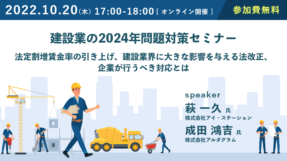 2022年10月20日(木)オンラインセミナー開催のお知らせ建設業の2024年問題対策セミナー~法定割増賃金率の引き上げ、建設業界に大きな影響を与える法改正、企業が行うべき対応とは~
