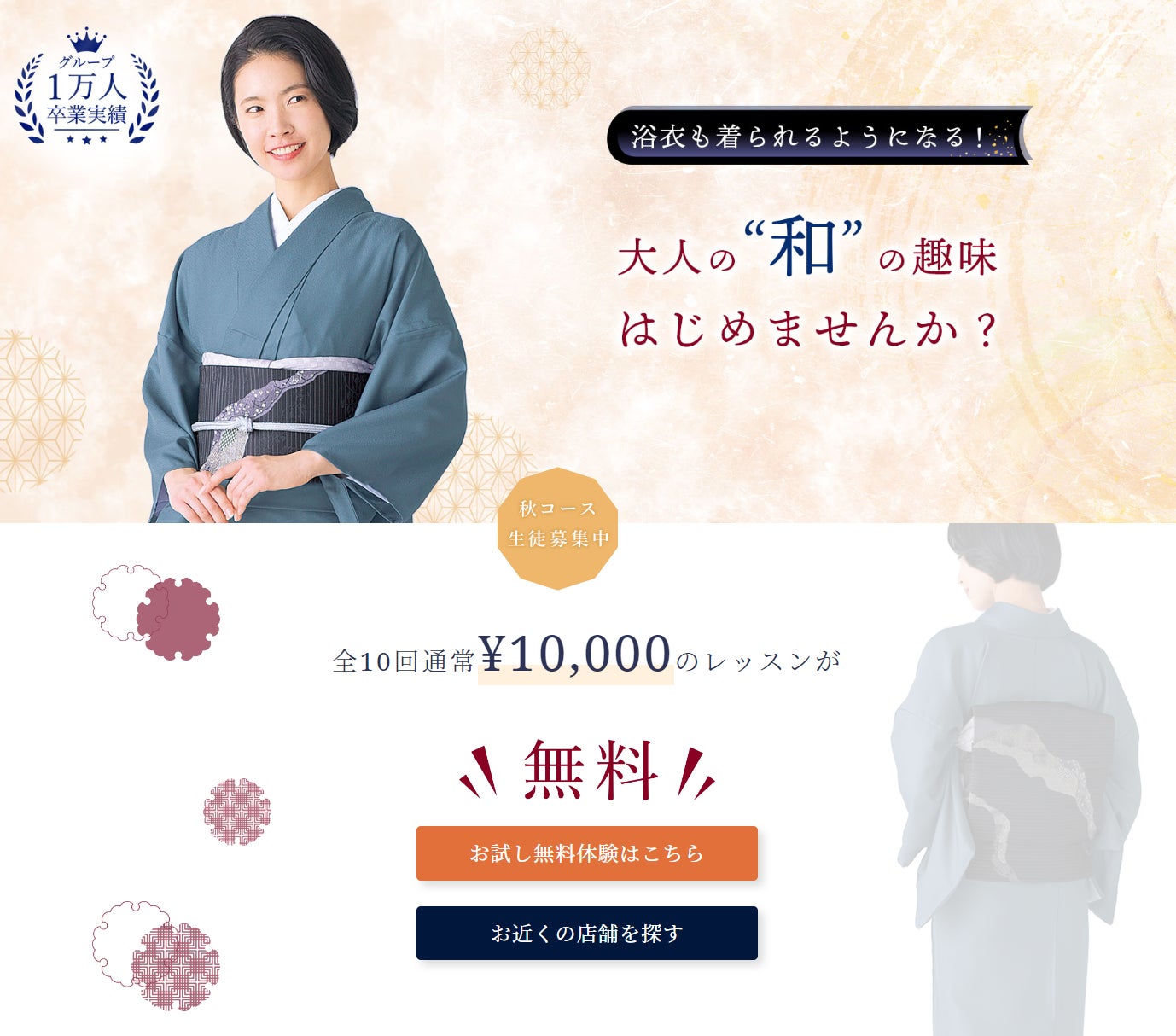 これにより「着方レッスン」に参加するまでの流れ、学ぶことのできる内容、参加にあたりご準備していただきたいもの、「着方レッスン」を行っている店舗の検索ができるようになり、「お試し無料体験のお申し込み」フォームから気軽にお申し込みができるようなりました。