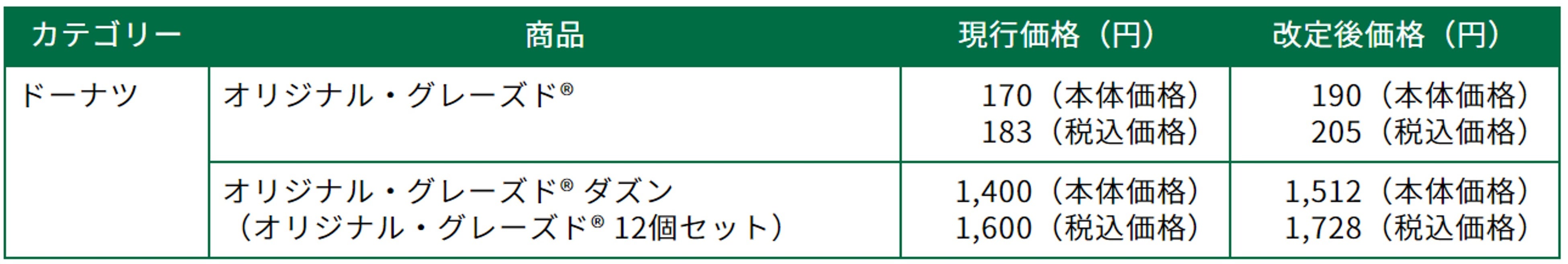 KKDJはこれまでも、生産性改善とコスト削減によって価格維持に取り組んでまいりましたが、昨今の経済環境の変化に伴う原材料価格・原油価格の高騰を踏まえ、ドーナツの品質を維持し安定的に商品をお届けするため、主力商品である『オリジナル・グレーズド®』の価格を見直すこととなりました。具体的には、『オリジナル・グレーズド®』を20円(本体価格)、『オリジナル・グレーズド® ダズン』を200円(本体価格)引き上げます。