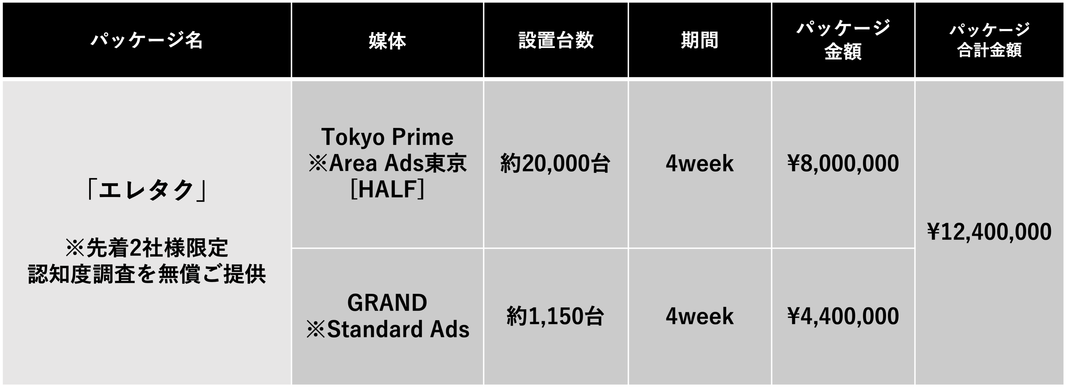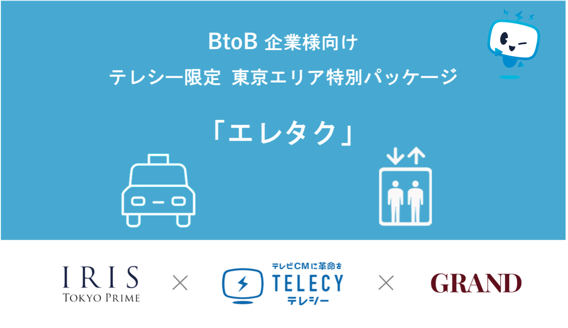 BtoB企業様向け東京エリア限定特別パッケージ「エレタク」は、近年急速に拡大しているタクシーサイネージメディアの中でも、日本最大(※1)の設置台数を誇る「Tokyo Prime」を運営する株式会社IRIS(本社:東京都港区、代表取締役:眞井 卓弥・宇木大介)と、東京都内シェアNo.1のエレベーターサイネージ「GRAND」を運営する株式会社東京(東京都新宿区、代表取締役:羅 悠鴻)との連携により実現した、テレシー独自のメニューを詰め込んだ特別パッケージとなります。
