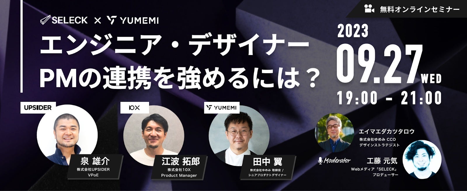 今回、泉のVPoE就任発表に合わせ、デジタル人材のためのメディア「SELECK」と、運営会社である株式会社ゆめみ様が主催する、ビジネスの現場におけるナレッジシェアを目的としたイベント「SELECK LIVE!」にて、記念イベントを開催いただけることになりました。