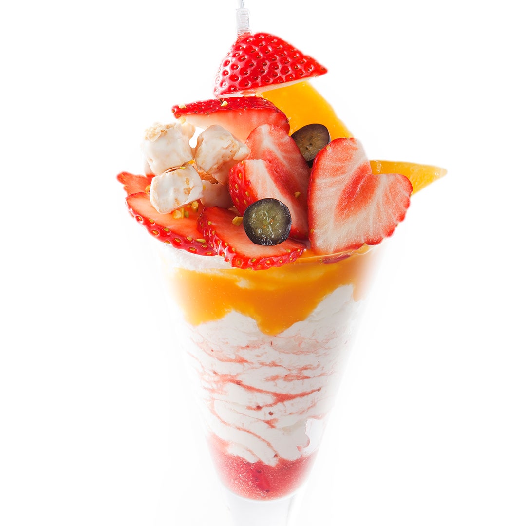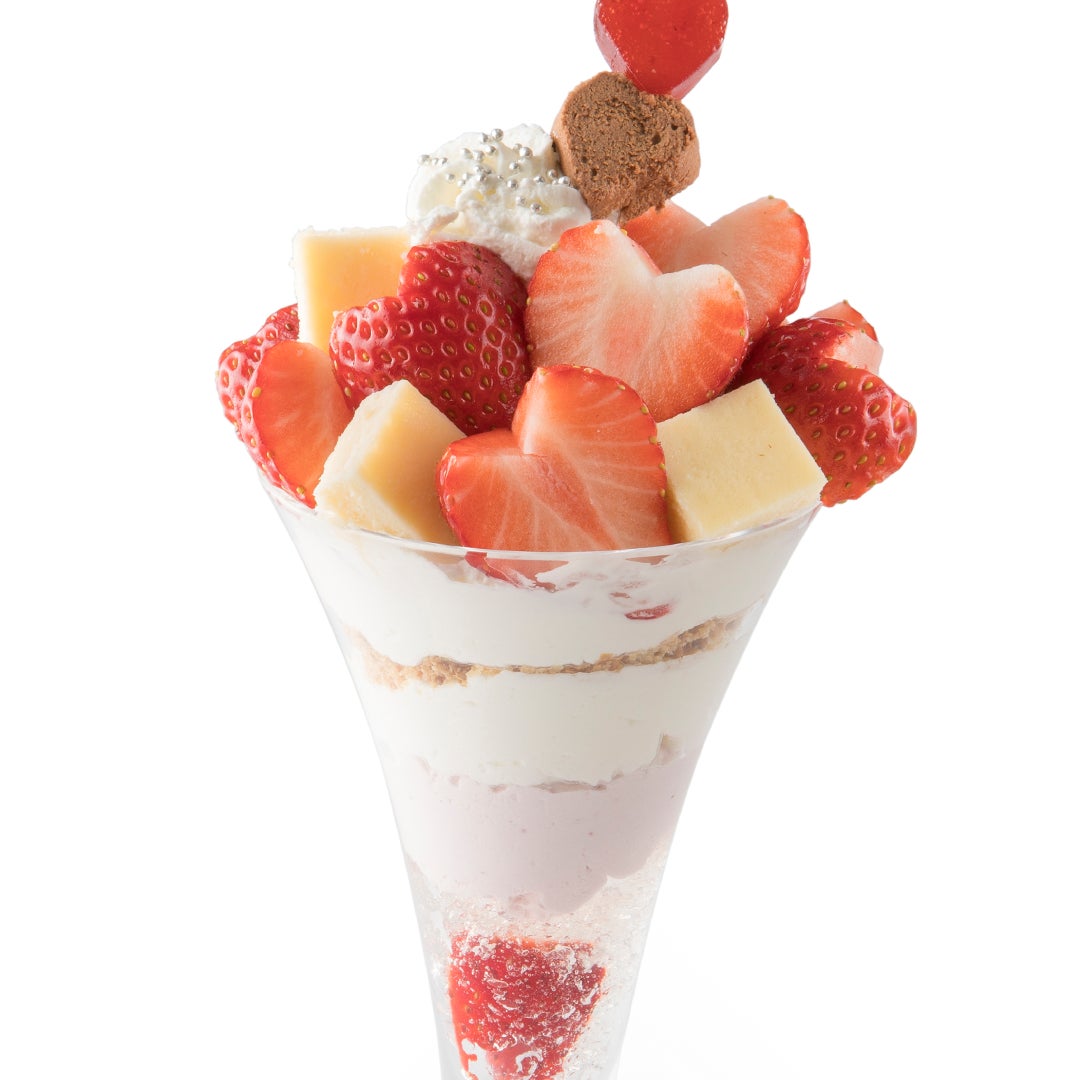 白を基調としたグラスにはソフトクリームや苺ババロアを重ね、華やかな赤色のハート型苺を飾りました。