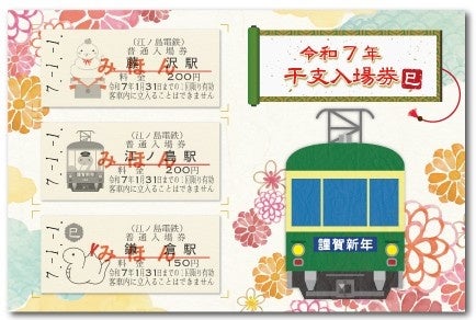 江ノ島電鉄株式会社(神奈川県藤沢市、社長 黒田 聡)では、2024年1月1日(水祝)より、「令和7年干支入場券(巳)」を数量限定で発売いたします。来年の干支である『巳』をモチーフにしたイラスト入り硬券入場券を、正月らしい縁起の良い特製台紙にセットしてお届けします。新年の幕開けを彩る特別な一枚として、また初詣の記念として、ぜひお手に取っていただければ幸いです。