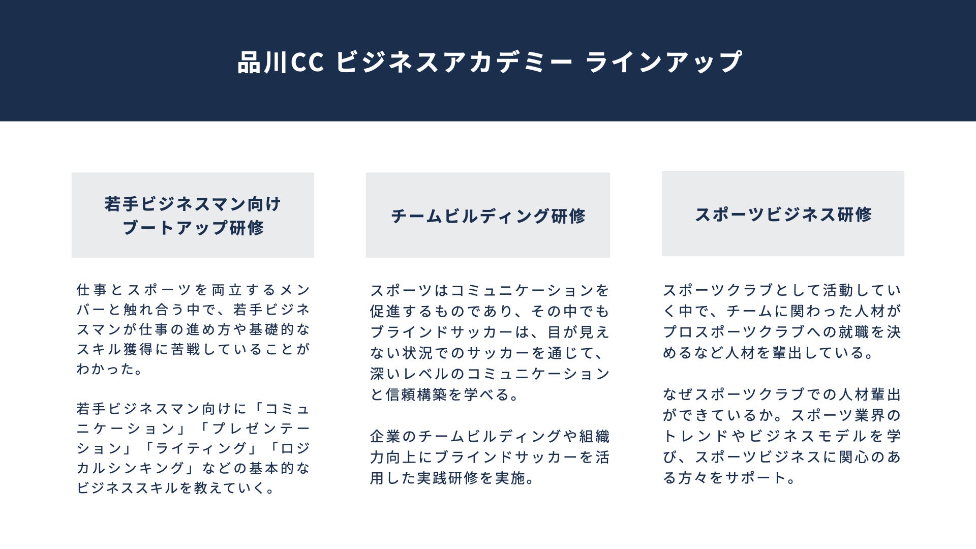 「品川CCビジネスアカデミー」は、スポーツの枠を超えたビジネス人材の育成、企業の組織力向上、スポーツビジネスの発展を目指して活動してまいります。