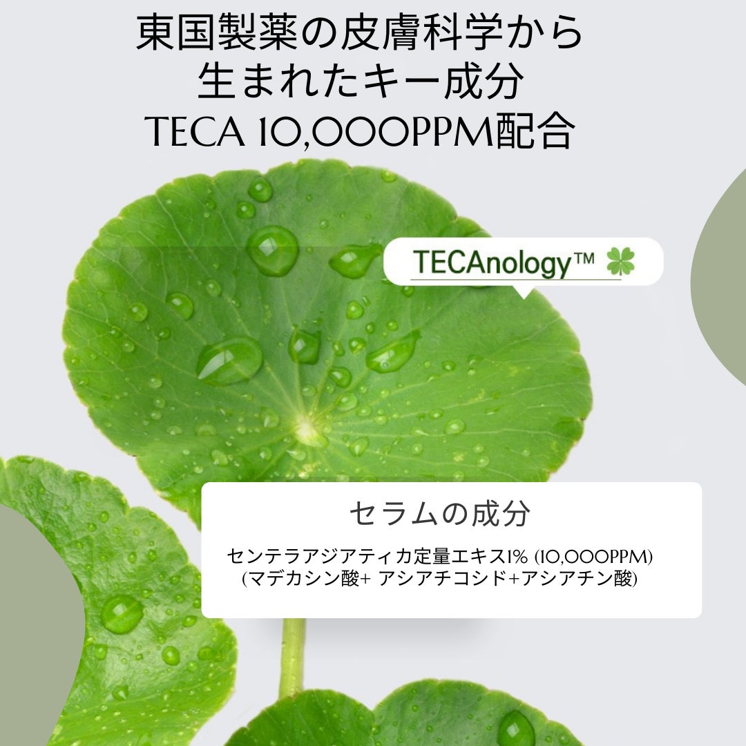 TECAとは、10kgツボクサから最終的にたった2kgしか取れない重要な成分で、ザ・マデカクリームにはこの成分がたっぷり10,000ppm含有されています。また、代表成分であるTECAをそのまま入れるのではなく、発酵工法適用し、カプセル化技術を開発。このカプセルに入れることで、もっと細かく、隅々まで有効成分を浸透をサポートします。
