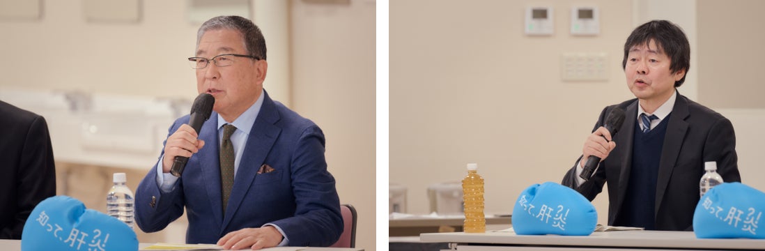 同席した宮坂先生は、ウイルス性肝炎について「肝炎ウイルスに感染することで、慢性的な炎症が繰り返され、肝臓が硬くなってしまいます。また、進行していくと、肝硬変や肝がんなど、治療が難しい病気に重症化してしまいます。」と話し、続けて徳光氏は、「肝臓は“沈黙の臓器”と言われており、シグナルがないんです。症状が重症化するとがんになってしまったりと、大変なことになりますので、そうなる前に“早期発見・早期治療”に取り組むことが非常に重要です。早期発見すれば副作用がほとんどない飲み薬で治療が出来るので、是非いわちくの従業員の皆さまにもウイルス検査を一度受けていただきたいです。」と話しました。