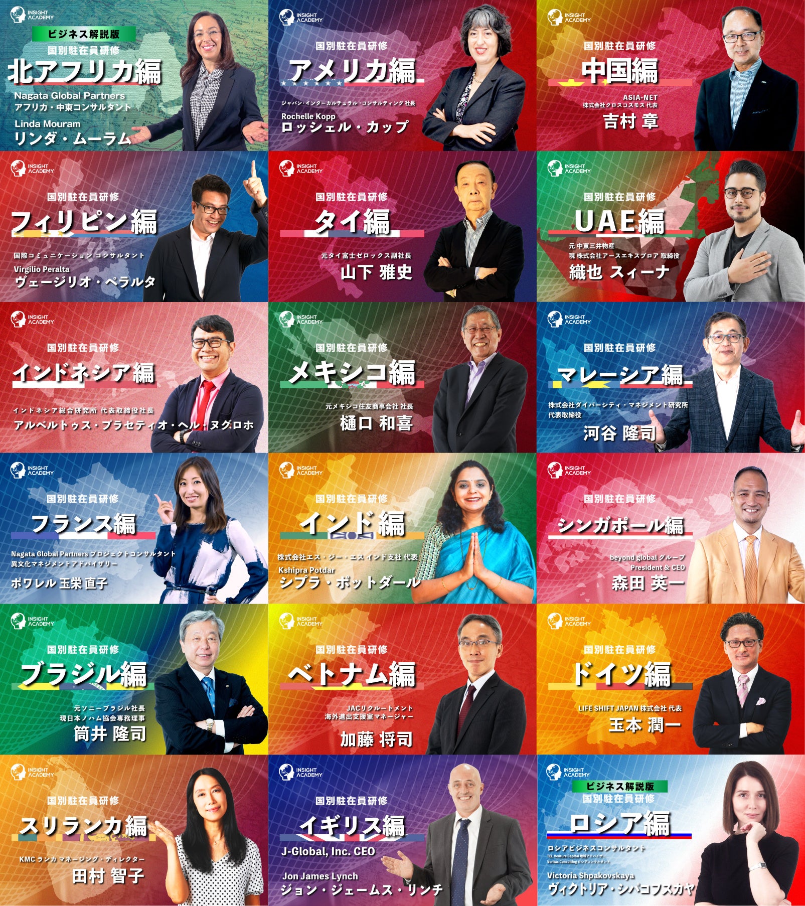 INSIGHT ACADEMYの国別駐在員研修シリーズは、対象国でのビジネス経験が豊富なプロフェッショナルを講師に迎え、海外駐在予定者・駐在間もない⽅、また国内海外事業従事者を対象に、現地スタッフと信頼関係を築いて成果を出す、というテーマでデザインされた講座です。