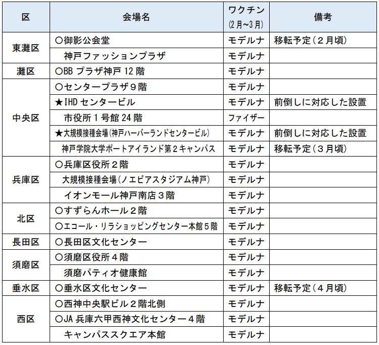 ※現在も接種を継続している会場(「市役所1号館24階」「エコール・リラショッピングセンター」「西神中央駅ビル」)を含め、全て2月5日(土曜)から接種を始めます。