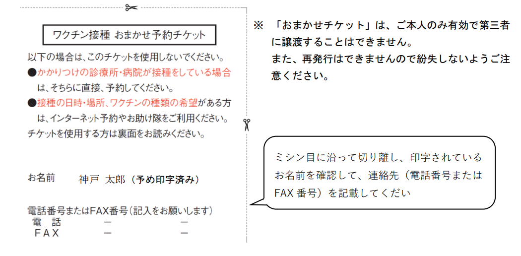 ・「おまかせ予約」をご希望される方は、接種券から「おまかせ予約チケット」を切り取り、お名前の確認と連絡先を記入して返信用封筒(接種券に同封)で神戸市に郵送してください。