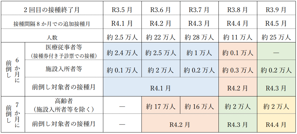 | 令和3年12月17日付厚生労働省健康局健康課予防接種室通知による接種間隔前倒しの考え方 1.医療従事者等及び高齢者施設等の入所者等に対する追加接種 (対象) 医療従事者等、高齢者施設等の入所者・従事者、通所サービス事業所の利用者・従事者、病院等の入院患者 (接種間隔) 初回接種の完了(2回目接種後)から6か月以上の間隔 2.その他の高齢者に対する追加接種 (対象) 1以外の高齢者 (接種間隔) 初回接種の完了(2回目接種後)から7か月以上の間隔(令和4年2月以降) |
